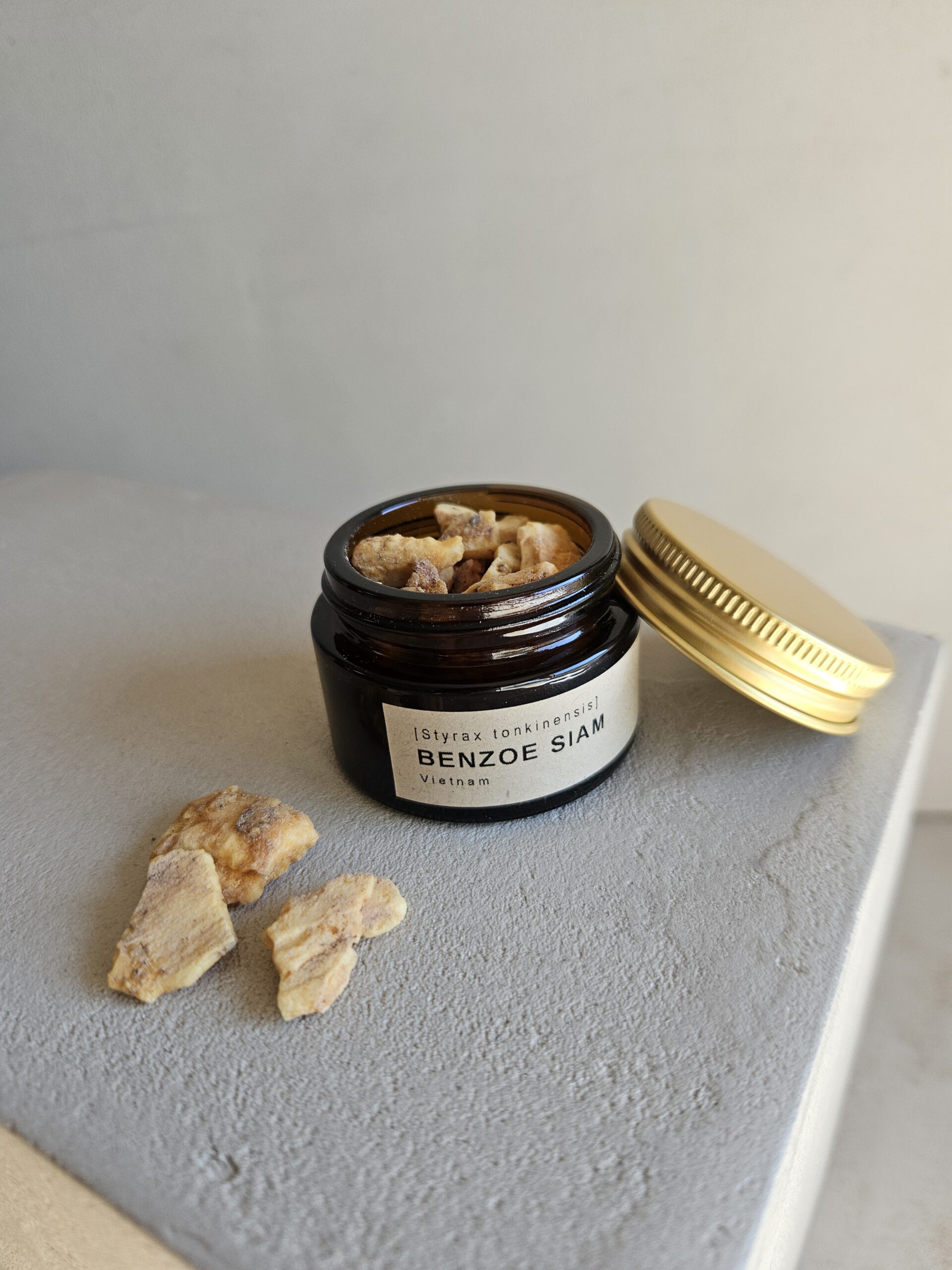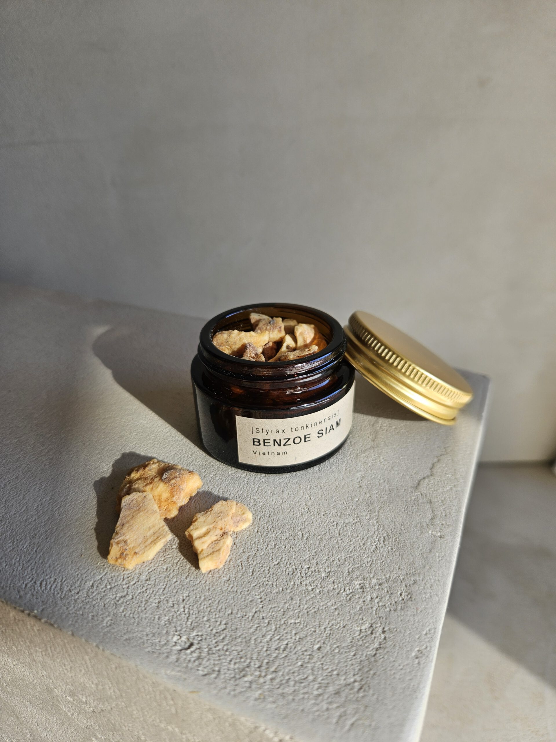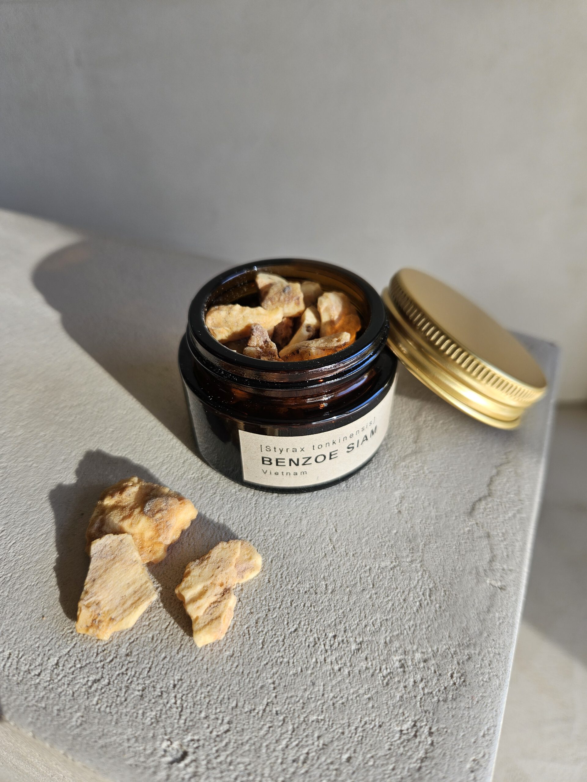 Das Harz ist leicht porös. Die Bruchstellen sind hell und dunkeln mit der Zeit nach. Benzoe räuchert man am Besten in Kombination mit anderen Hölzern und Harzen wie Sandelholz, Myrrhe oder Labdanum. Allein verräuchert kann es Hustenreiz auslösen. Es empfiehlt sich außerdem ein sparsamer Einsatz, da das kostbare Harz sehr intensiv ist. Der Duft wirkt sinnlich, entspannend und aphrodisierend.