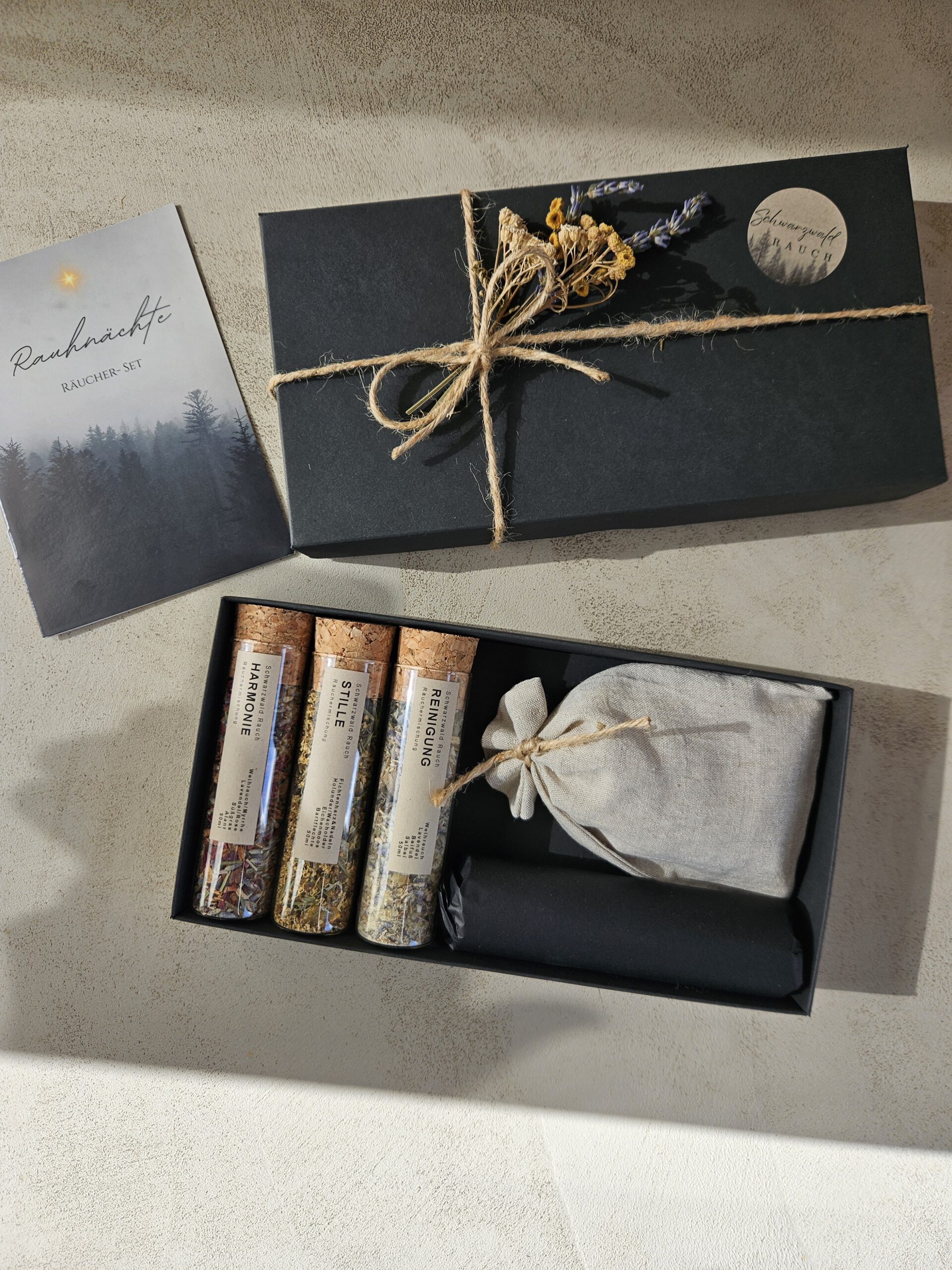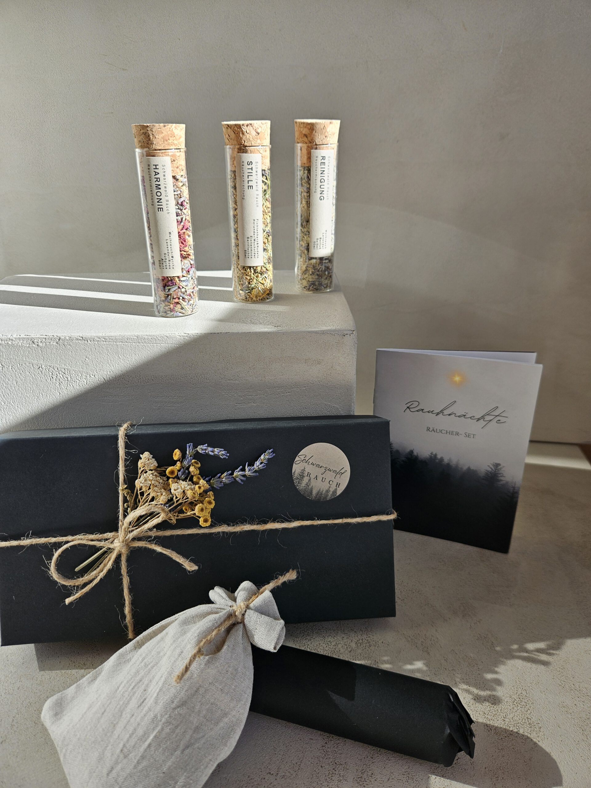 Das Rauhnächte Räucherset mit 3 Räuchermischungen für die Rauhnächte, stilvoll verpackt. Jede Räuchermischung wurde aus heimischen Kräutern und edlen Harzen zusammengestellt auf der Basis überlieferter Räuchertraditionen.