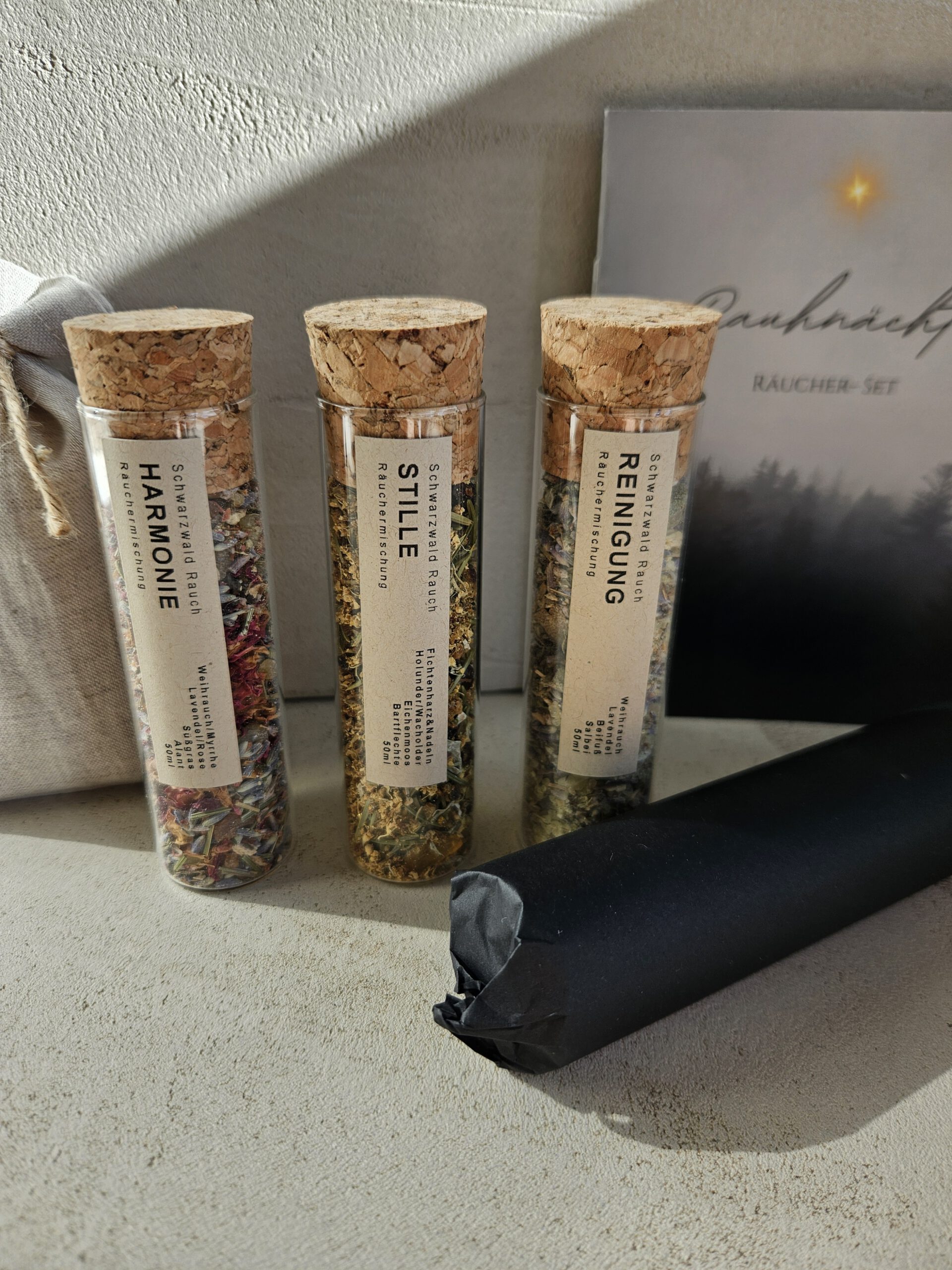 Enthalten sind 3x 50 ml Gläser mit den Mischungen „Reinigung“, „Stille“ und „Harmonie“.