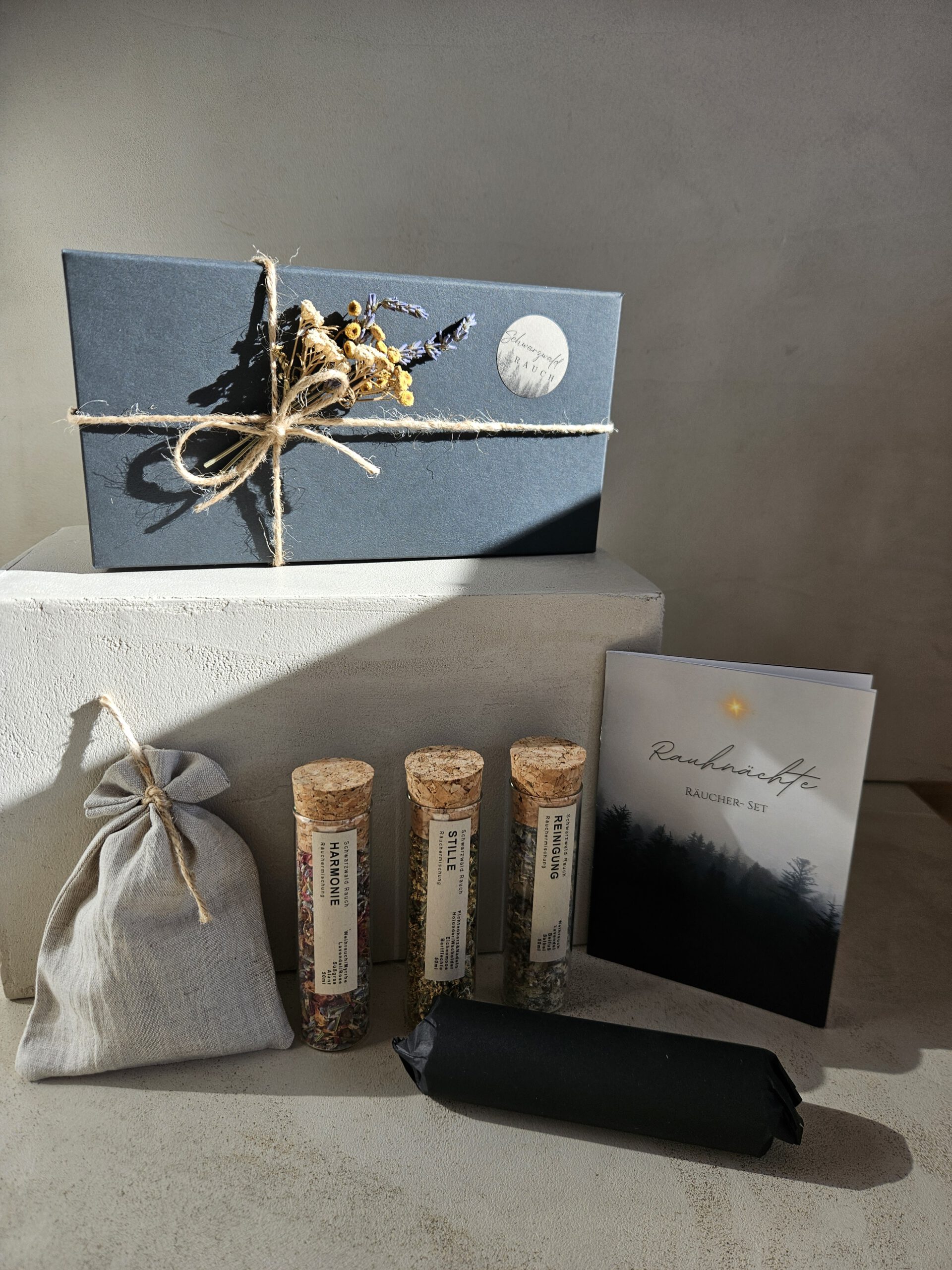 Enthalten sind außerdem 10x Räucherkohle, Sand im handgenähten Leinensäckchen und eine ausführliche Räucheranleitung, sowie einer thematischen Einführung in die Rauhnächte.
